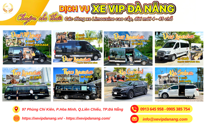 Xe VIP Đà Nẵng ( tên tiếng anh: Da Nang Luxury Car) luôn mang đến cho quý khách dịch vụ VIP Limousine Đà Nẵng 9 chỗ, 12 chỗ, 19 chỗ, 29 chỗ sang trọng và nhiều loại xe cao cấp, hạng sang đời mới theo tiêu chí: Da Nang Luxury car, VIP Car, VIP Care.